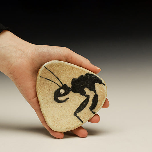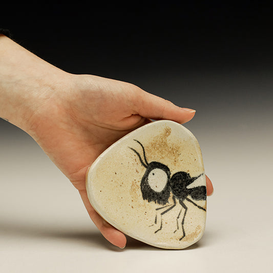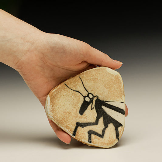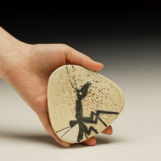 More often than not Kirk does whimsical drawings on his pots using slips and black underglaze. His work has been slowly evolving to enhance the contrast of slip to raw clay… the work is fired with red pine in a double-chambered bourry box kiln with a relatively light application of salt, kept below Cone 11. His work is unpretentious and brings a heartfelt joie de vivre in dark times.